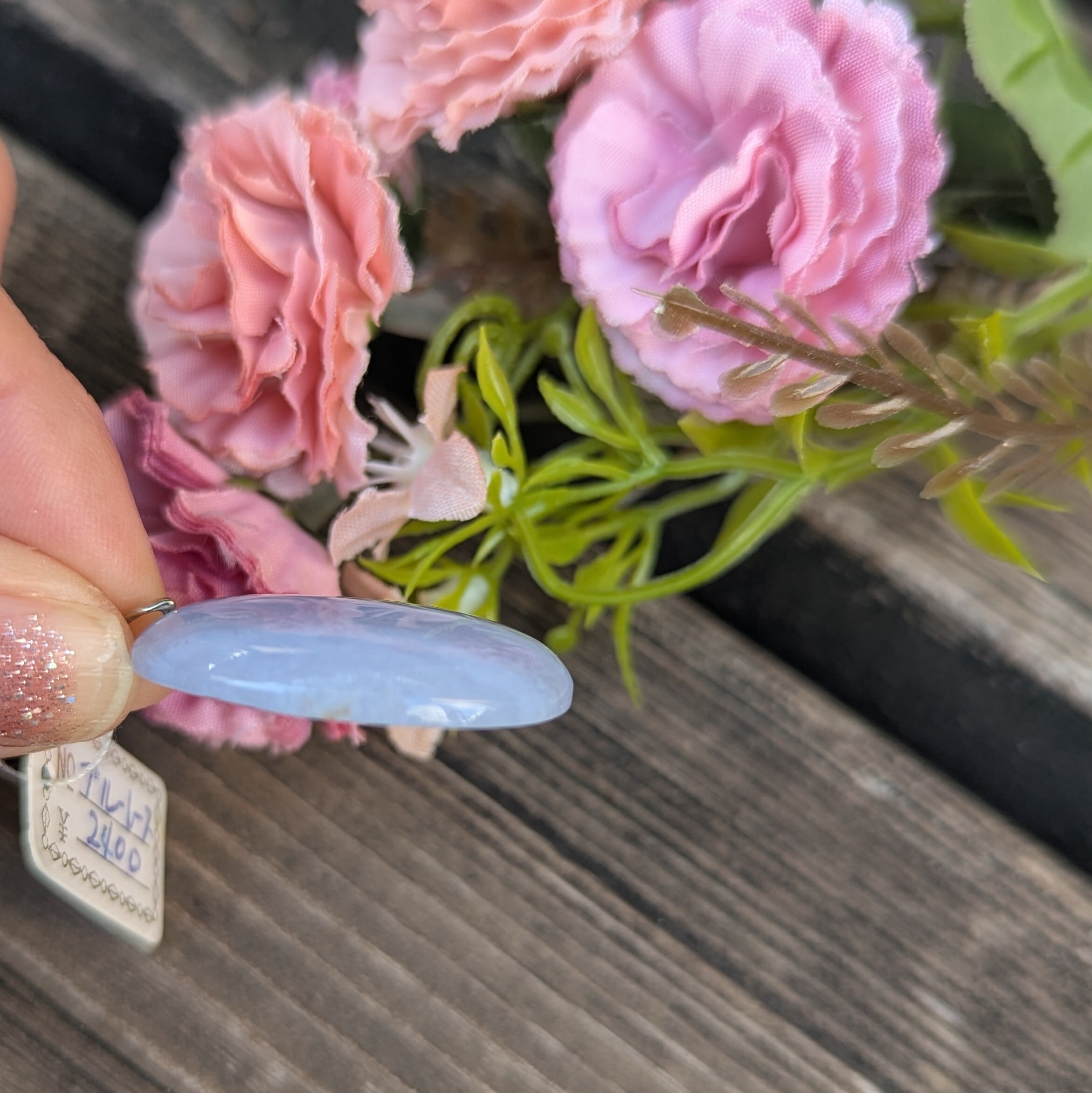 ブルーレースアゲートは古くから危険回避のお守りとして使われ、「神の石」と呼ばれていました。また、穏やかな青空のような石は安心感と心の平常心を保つパワーストーンと言われています。