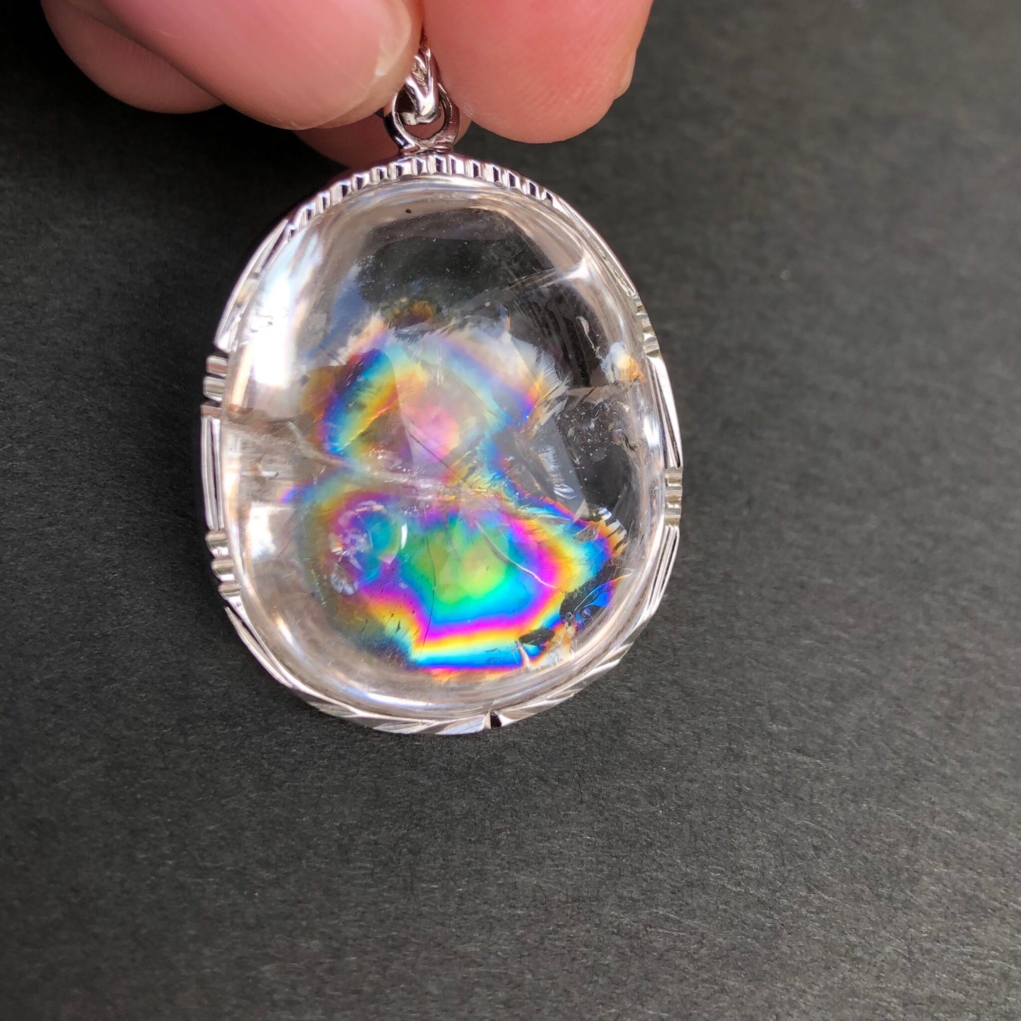 整ったクォーツにはっきりと虹が見え、眩しいぐらいのアイリスクォーツ。動かすとあちらこちらに全体的に虹があるのが分かります。表面だけで無く裏面からも虹が見えます。