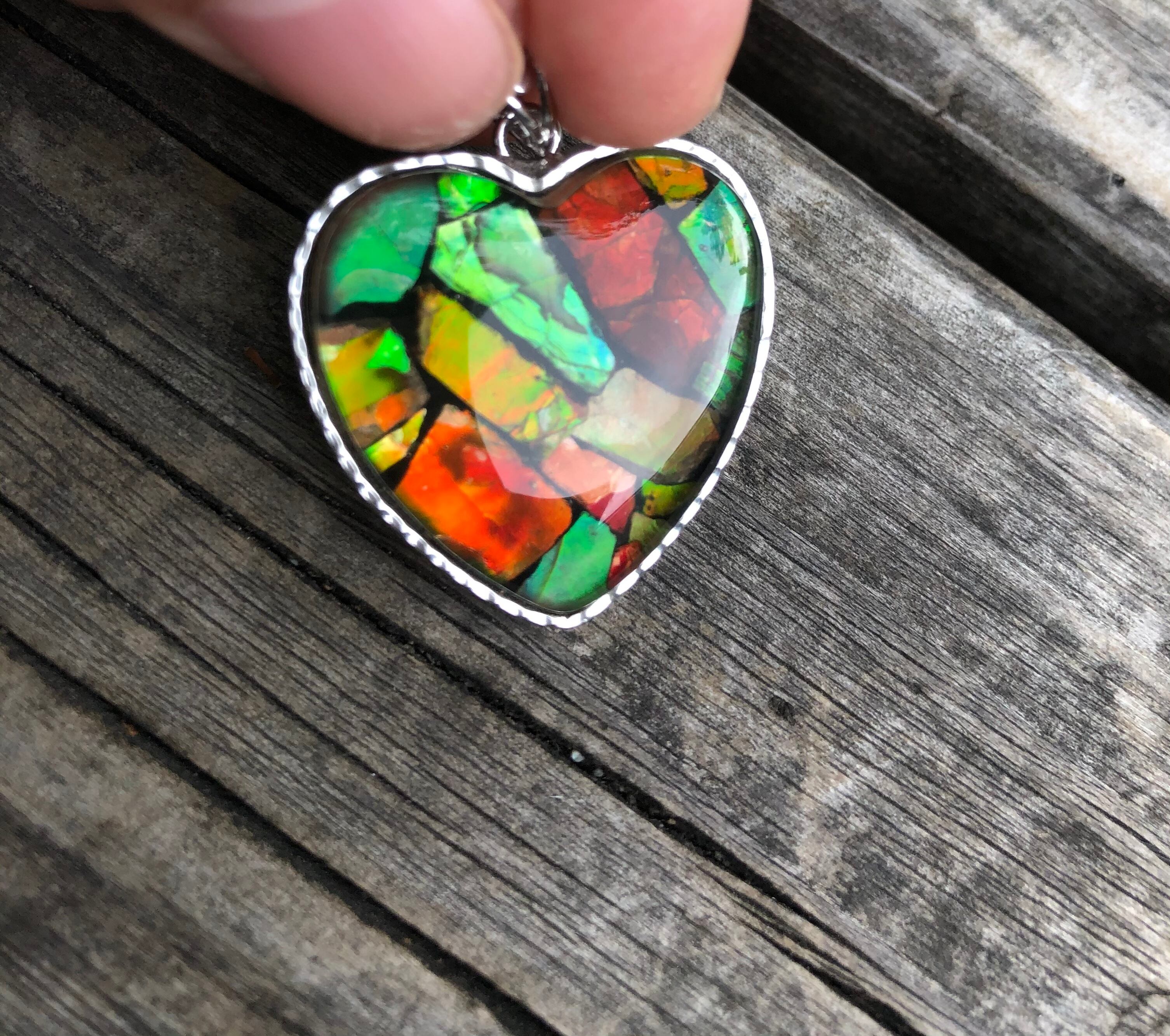 こちらは少し大きめのハート型で存在感があります。アンモライトの綺麗な色の部分をカットしてコラージュのように合わせて、上にカットした水晶で覆いました。まるで万華鏡のみたいに本当に綺麗です。