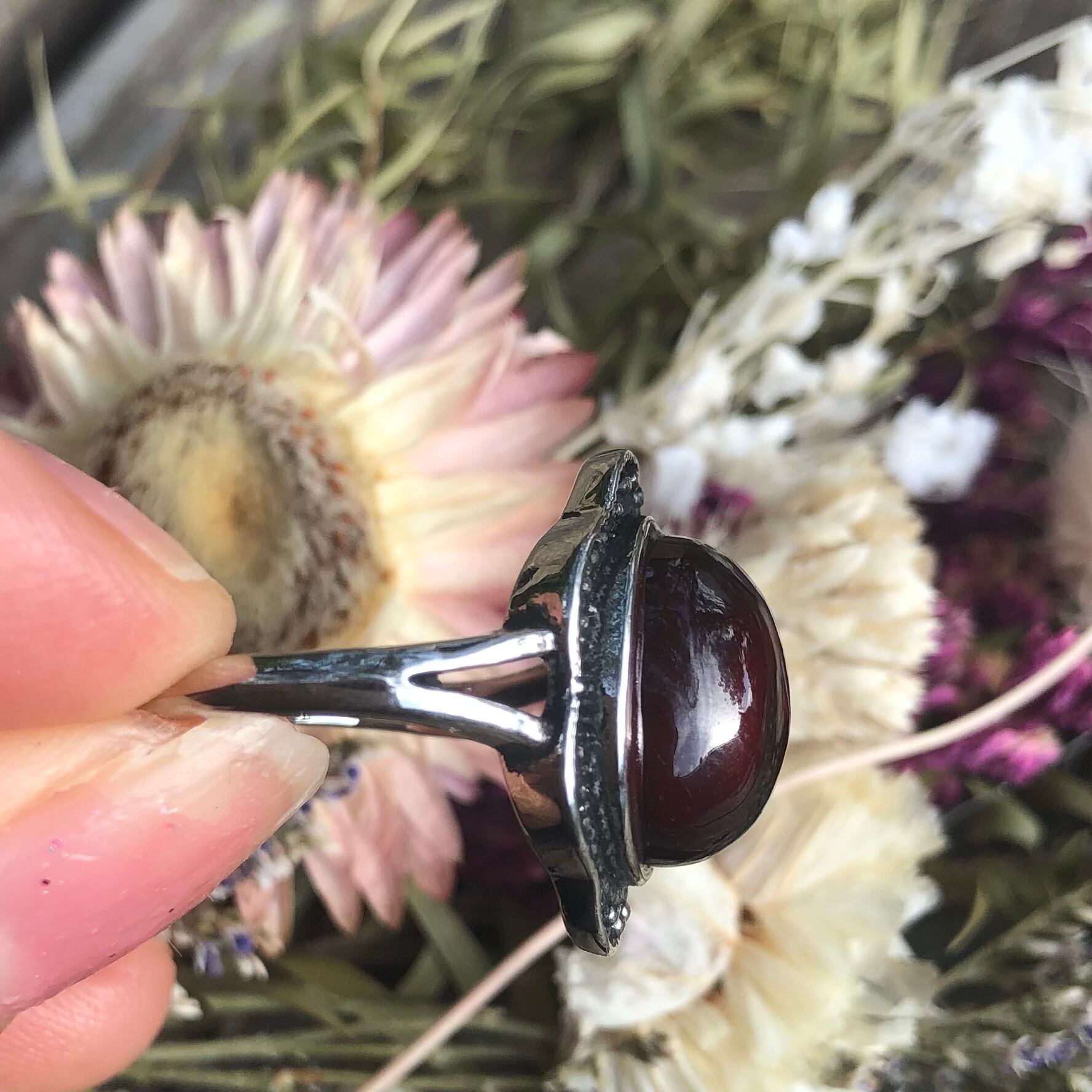 ガーネットの赤は肌を色白に見せてくれる効果があります。アンティークな雰囲気で指を優しく綺麗に見せてくれます。