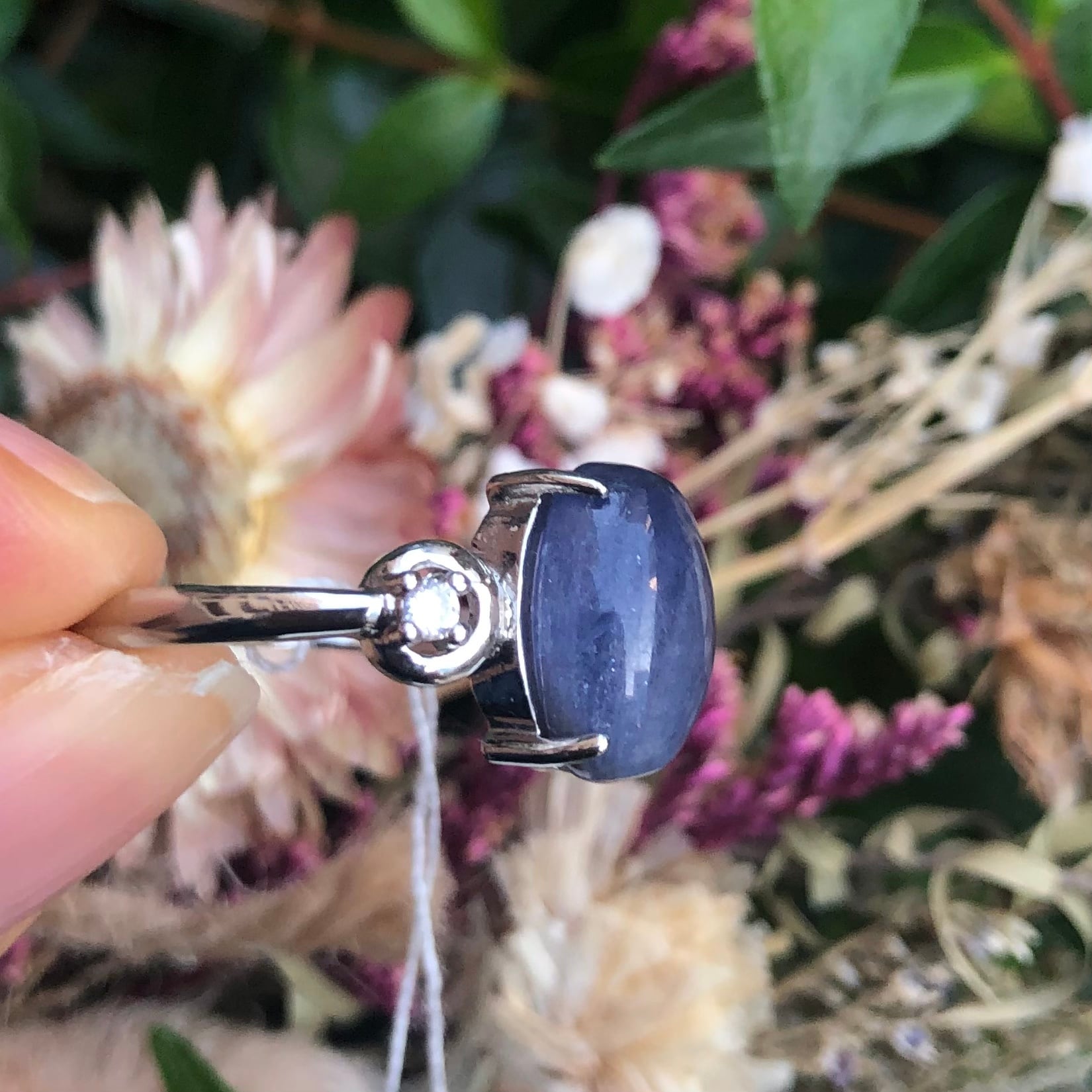 こちらは濃いめのバイオレットブルーのタンザナイトの指輪です。タンザナイトは文字通りタンザニアの夜を意味します。