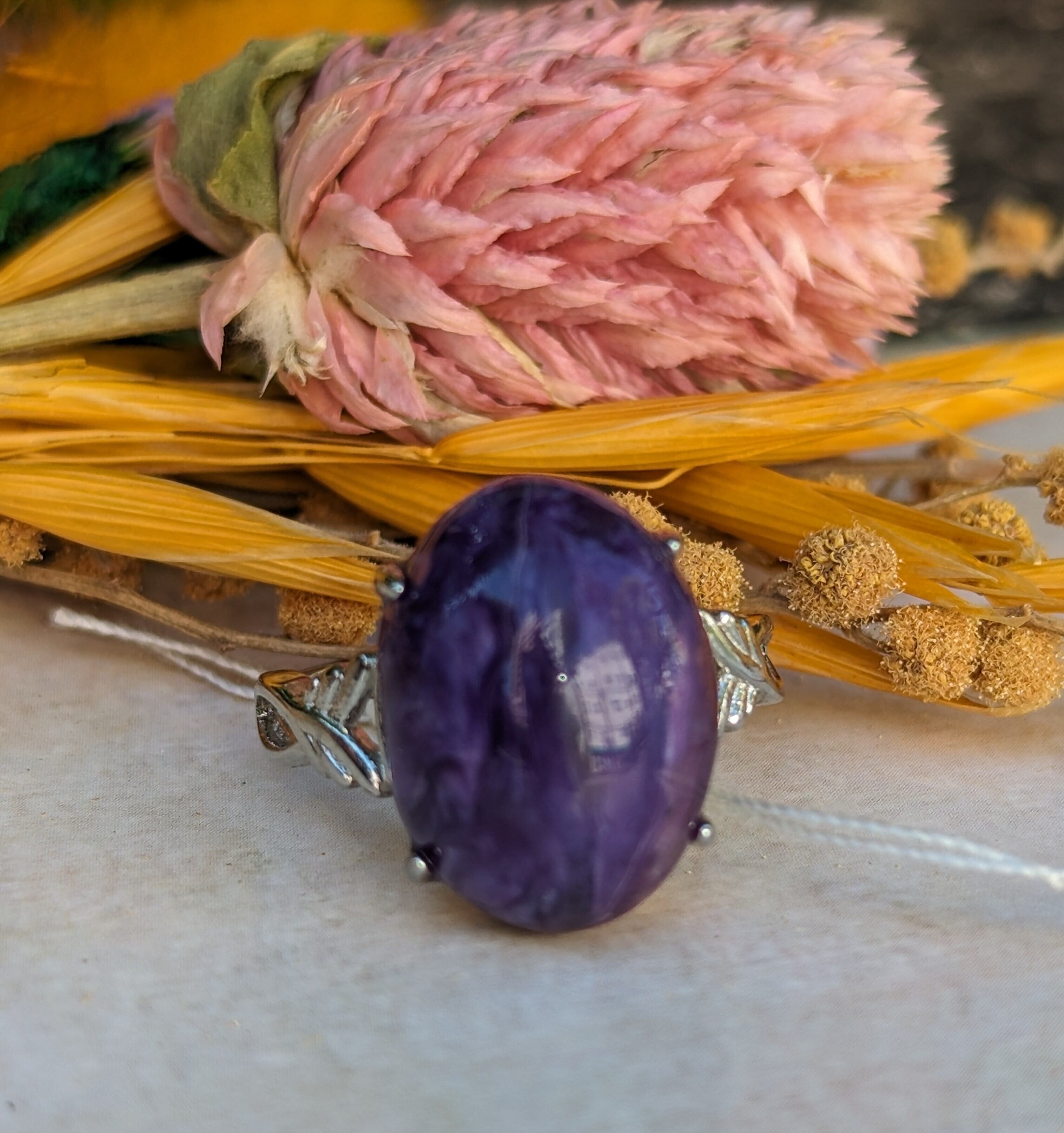 希少なロシア産チャロアイトの指輪になります。昨今の社会情勢により入手困難な天然石になります。(今回偶々卸屋さんの方で在庫が有った為譲っていただきました。)